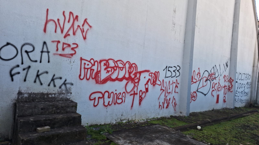 Pichações foram feitas na parte externa, atrás do ginásio e nos muros e no módulo portas foram arrombadas e quebradas, também foram pichadas as paredes de dentro dos vestiários do campo.